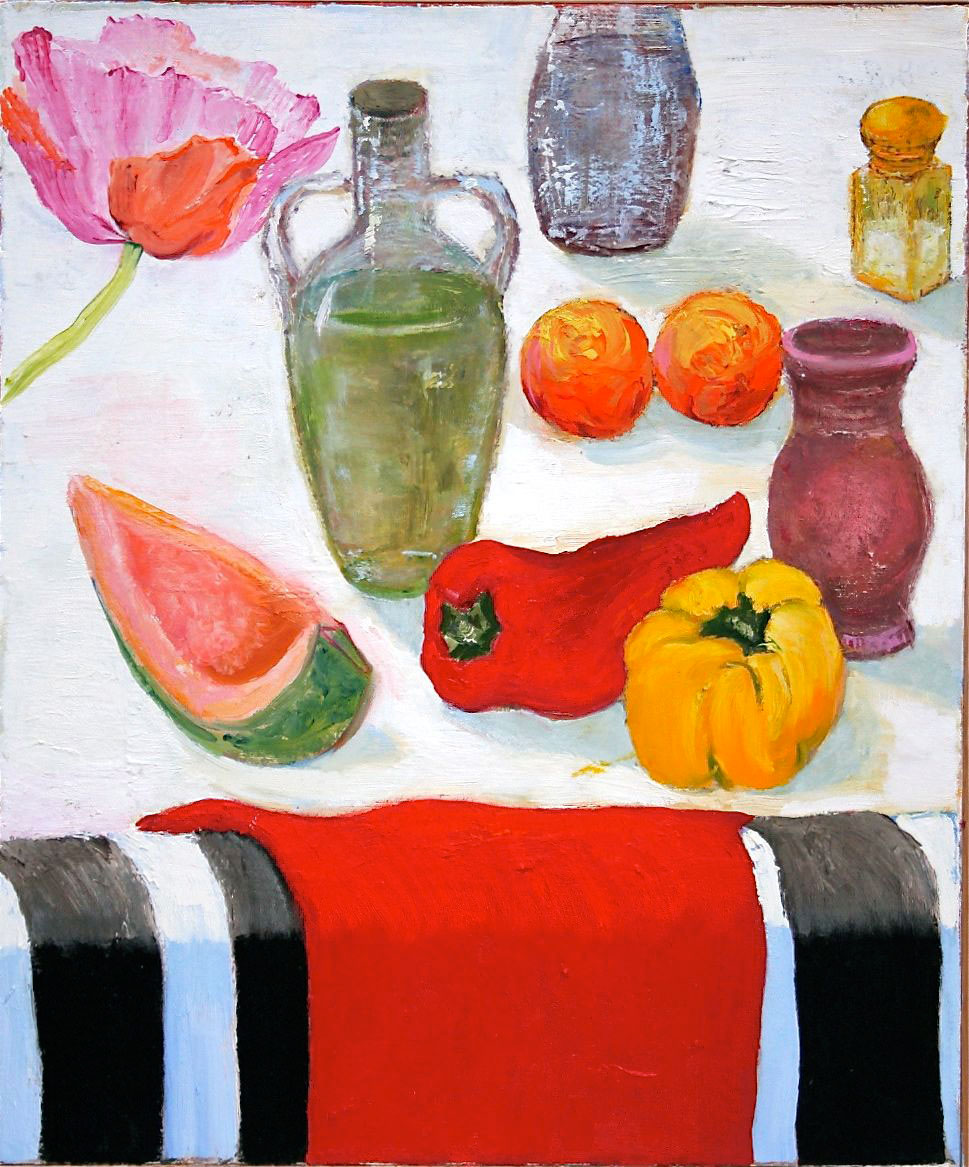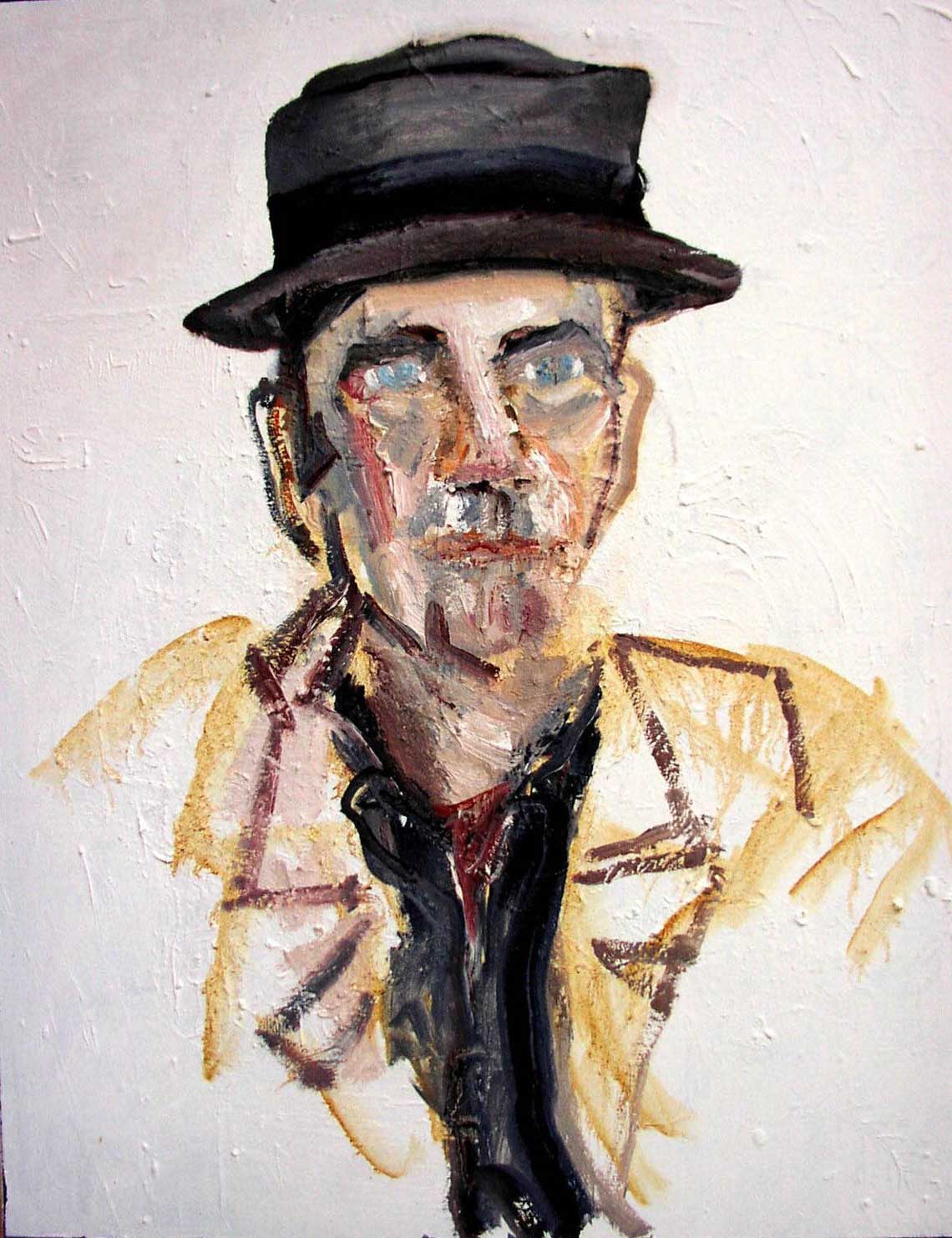 Porkpie Hat Woman with Red Bird Still Life Behind Sofa